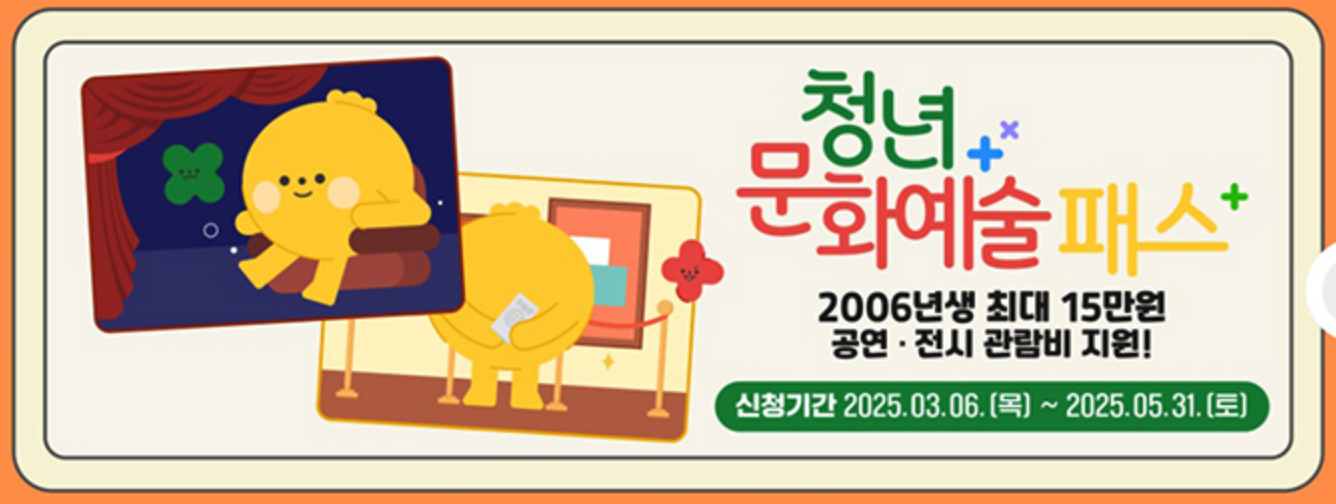 청년문화예술패스는 단순한 관람비 지원을 넘어, 청년들이 문화예술을 보다 가깝게 접하고 즐길 수 있는 기회를 제공합니다. 만 19세라면 지금 바로 신청하고, 연극, 전시, 클래식 등 다양한 문화예술의 세계를 경험해보세요.