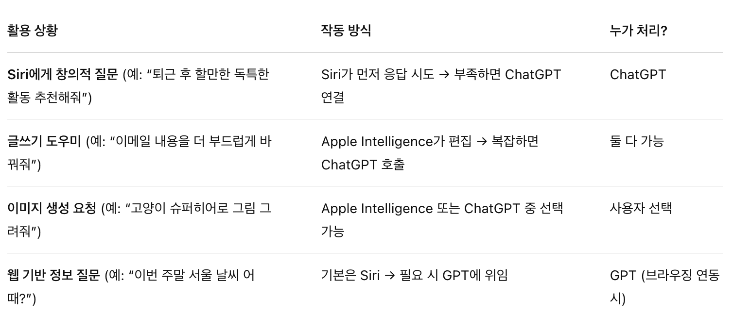 아래에서 Apple Intelligence와 ChatGPT가 어떻게 연결되고, 어떤 식으로 활용할 수 있는지 구체적으로 설명드릴게요.