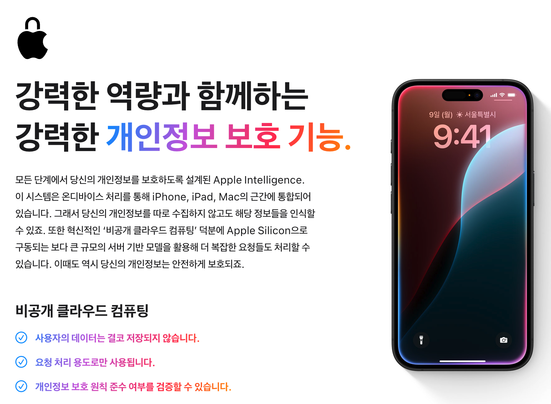 애플은 "프라이버시 우선 설계(Private Cloud Compute)" 정책을 적용하고 있습니다.