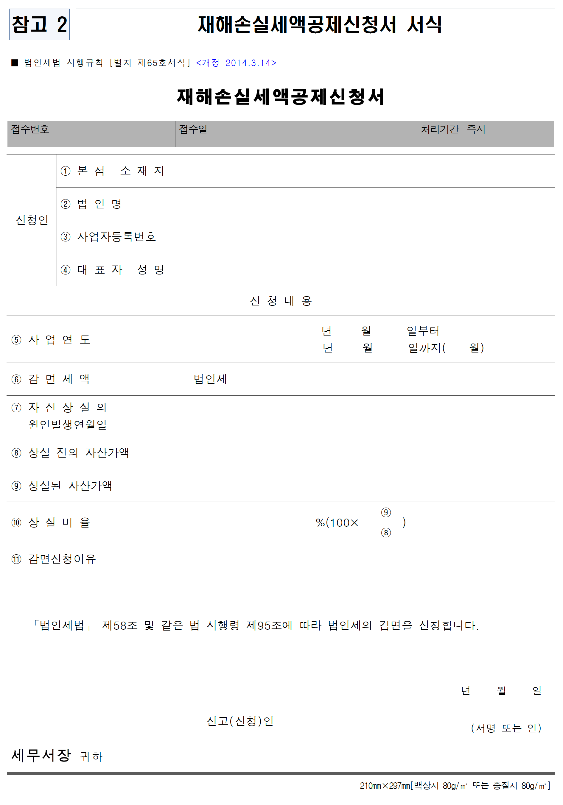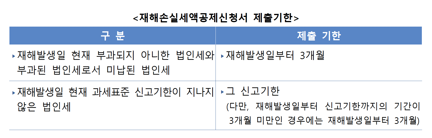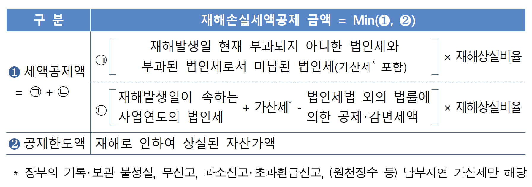 | 대상 | 재해로 사업용 자산의 20% 이상 상실한 법인 |