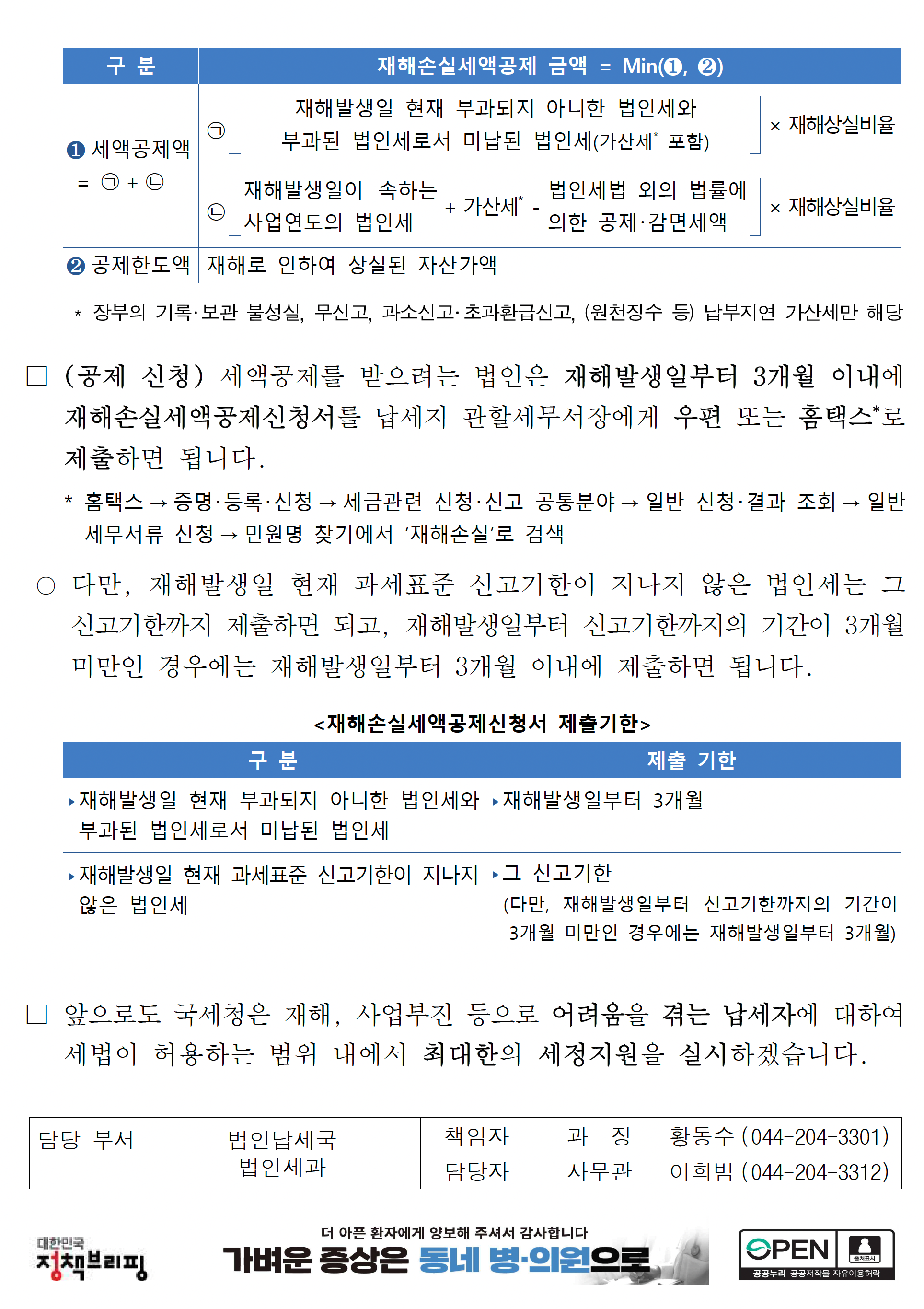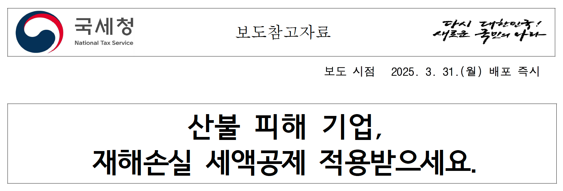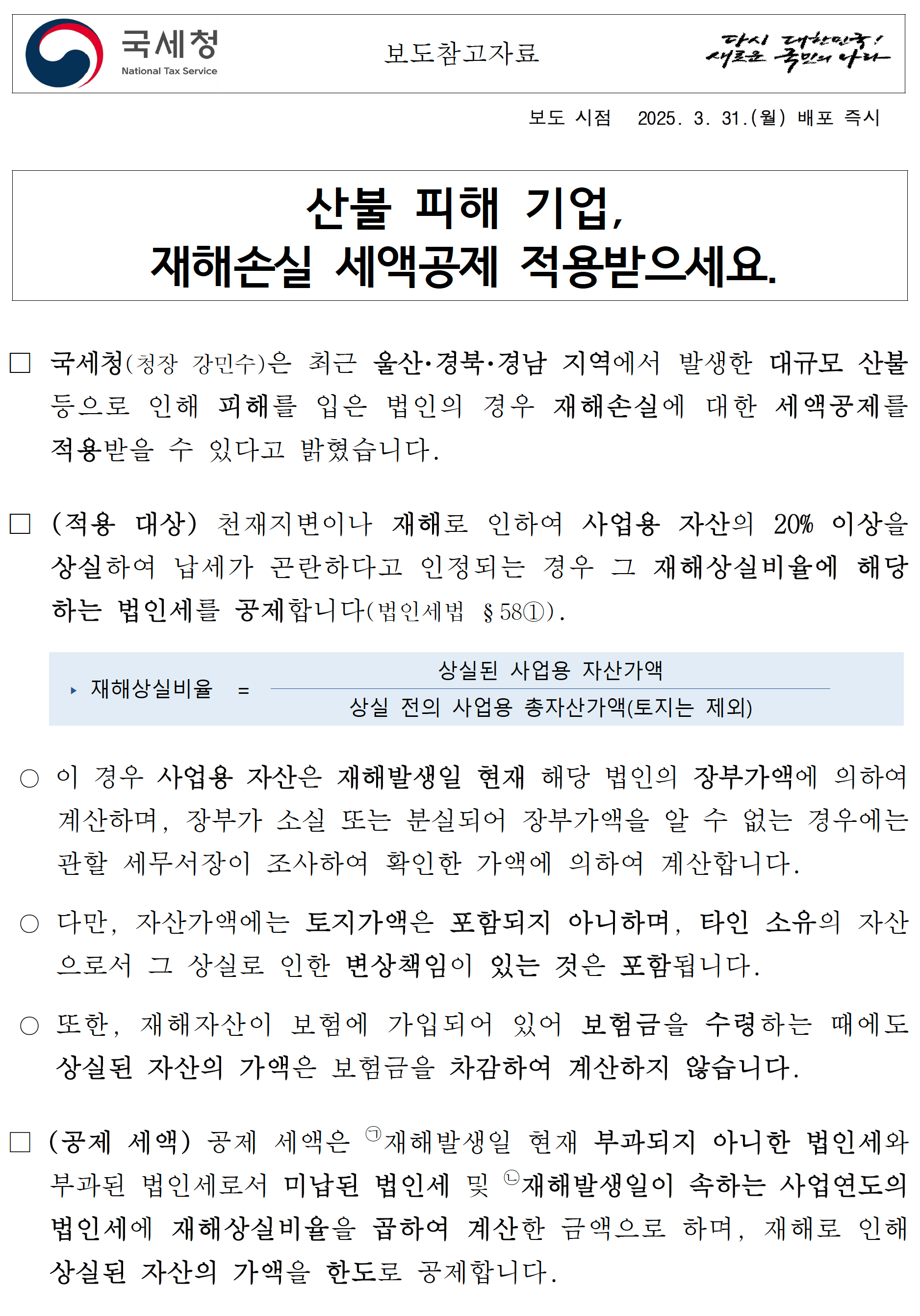 국세청(청장 강민수)은 최근 울산・경북・경남 지역에서 발생한 대규모 산불 등으로 인해 피해를 입은 법인의 경우 재해손실에 대한 세액공제를 적용받을 수 있다고 밝혔습니다.