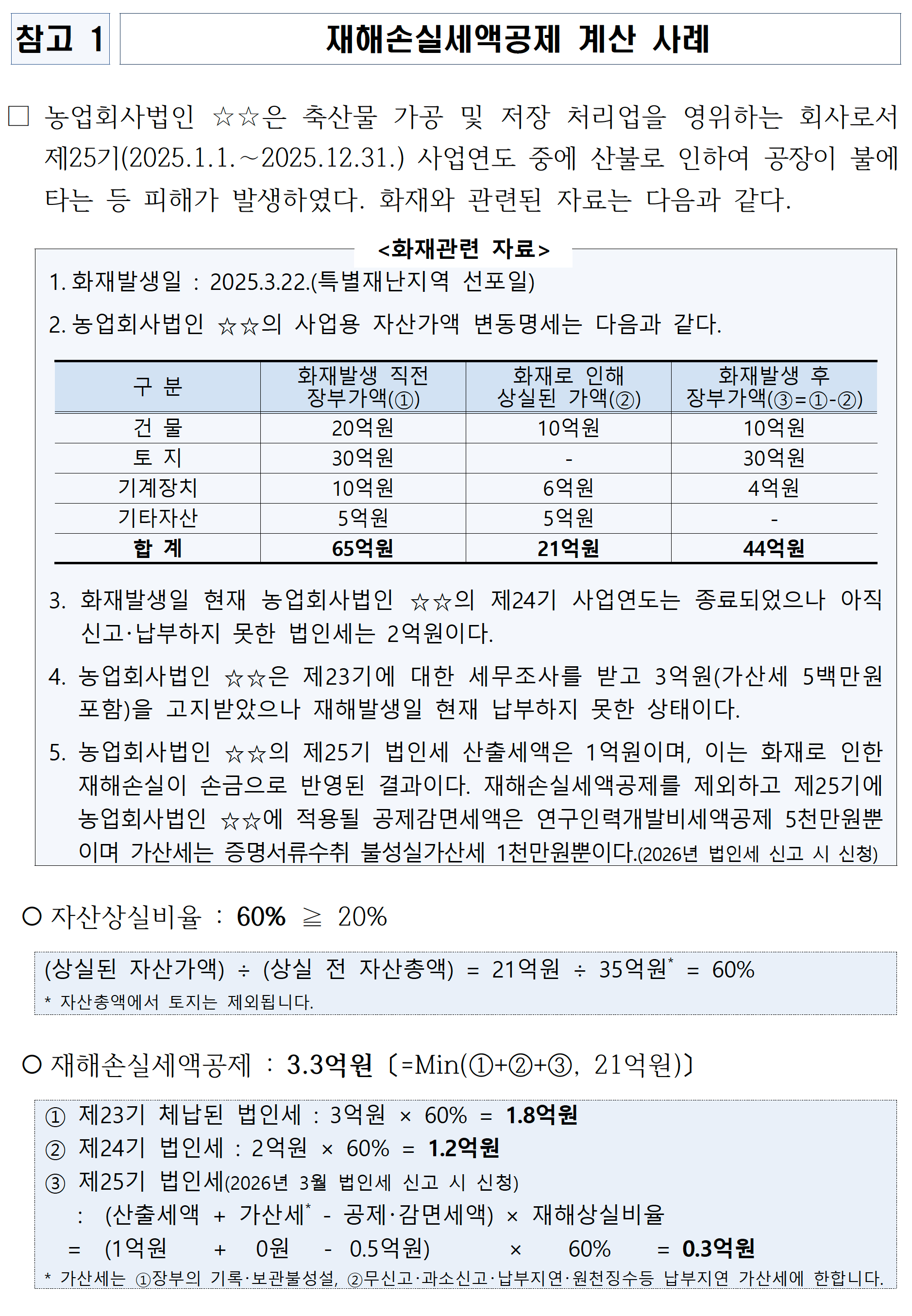 (적용 대상) 천재지변이나 재해로 인하여 사업용 자산의 20% 이상을 상실하여 납세가 곤란하다고 인정되는 경우 그 재해상실비율에 해당하는 법인세를 공제합니다(법인세법 §58①).